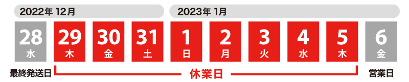休業期間中にいただきました「お問い合わせ」および「商品発送」につきましては1月6日(金)より順次対応させていただきます。