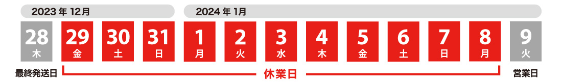 休業期間中にいただきました「お問い合わせ」および「商品発送」につきましては1月9日(火)より順次対応させていただきます。