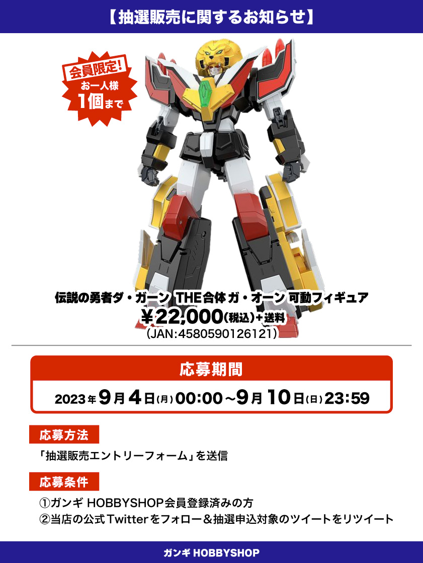 人気の商品となっておりますので抽選販売とさせていただきます😌⬇応募はこちら🌟https://t.co/yRlLS1aY8p#伝説の勇者ダ・ガーン #ダガーン #ガオーン #抽選販売 pic.twitter.com/sYcKIiaMnM