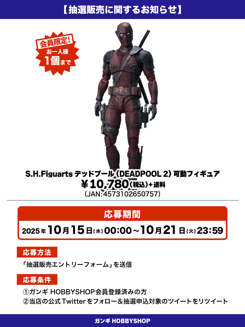 人気の商品となっておりますので抽選販売とさせていただきます😌⬇応募はこちら🌟https://t.co/NgMutIMdUc#デッドプール #マーベル #抽選販売 pic.twitter.com/7UyTIdep9g