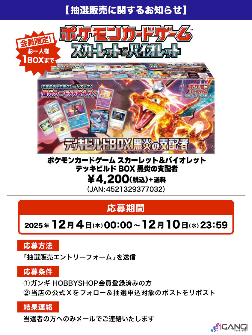 ※結果は当選者にのみお送りいたします。#ポケカ #抽選販売 #入荷 pic.twitter.com/6n7LALB9Q2— ガンギ HOBBYSHOP (@MS_GANGI) December 4, 2025