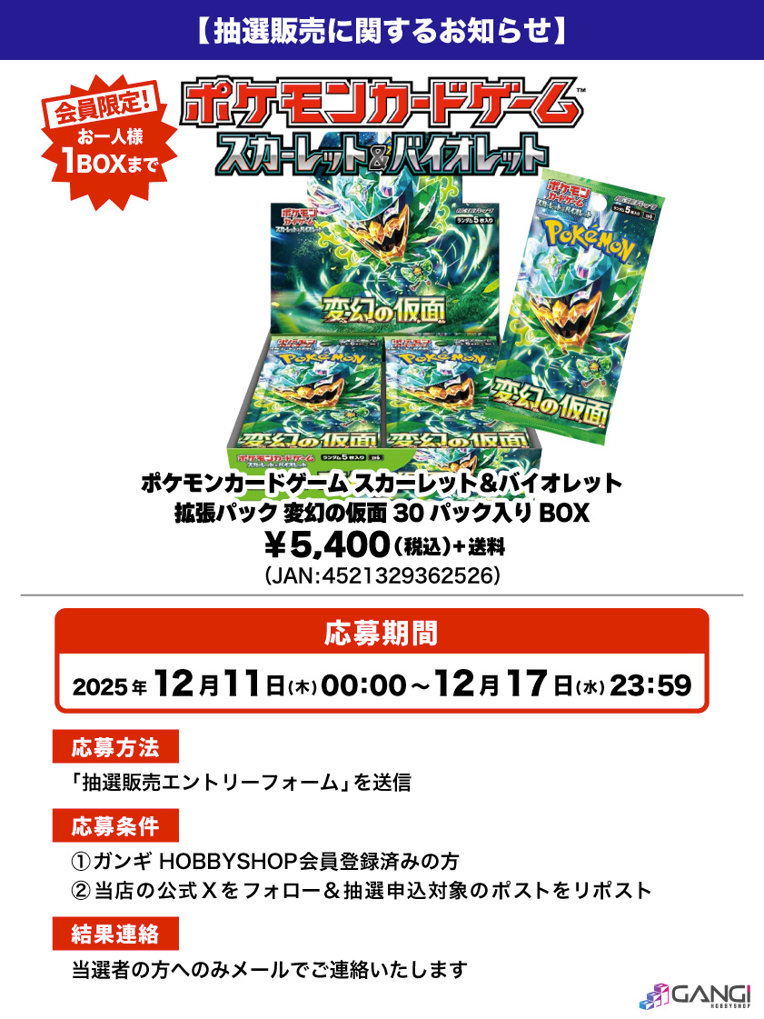 ※結果は当選者にのみお送りいたします。#ポケカ #抽選販売 pic.twitter.com/VtxtcHHkNV— ガンギ HOBBYSHOP (@MS_GANGI) December 11, 2025