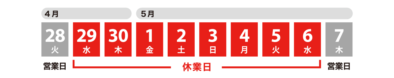 誠に勝手ながら、弊社では下記日程をGW休業とさせていただきます。